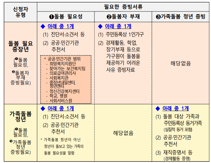 돌보거나 그로 인해 생계 책임을 지고 있는 청년(13세 ~ 34세)이 신청할 수 있습니다.
