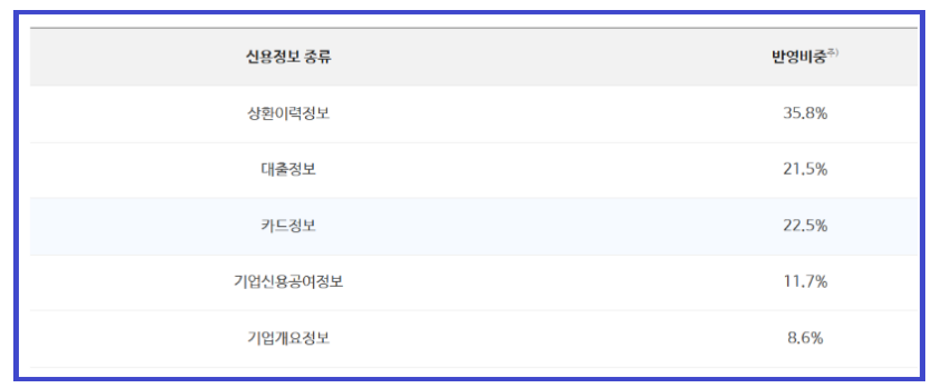√ 상환이력정보 35.8%, 대출정보 21.5%, 카드정보 22.5%,