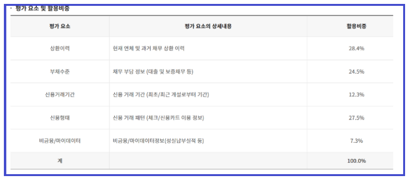 √ 상환이력 28.4%, 부채 수준 24.5%, 신용거래기간 12.3%, 신용형태 27.5%,