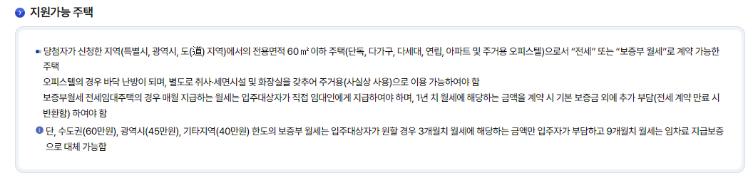 √ 단, 수도권(60만 원), 광역시(45만 원), 기타 지역(40만 원) 한도의 보증부 월세는