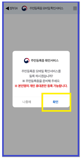 4. 정부24 모바일 신분증 발급 관련 안내 창이 팝업 되면 '확인' 버튼을 누릅니다.