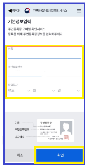 7. 마지막으로 '실물 신분증에 기재된 이름, 주민번호, 발급일자 등 기본 정보를 입력하고