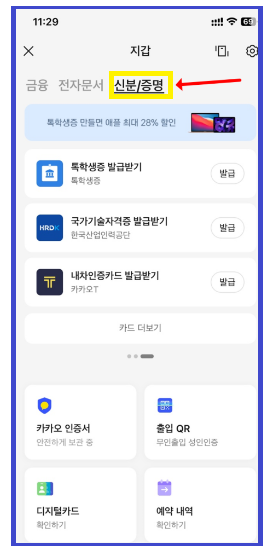 3. 상단에 있는 카카오 지갑 → 신분/증명을 클릭합니다.