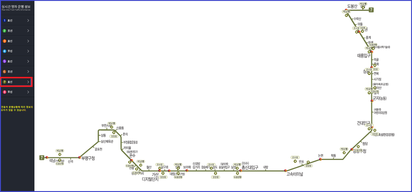 7호선은 갈녹색으로 구성되어 있으며, 세부 노선명은 서울 지하철 7호선 입니다.