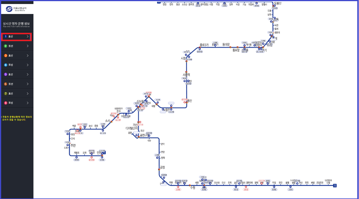 1호선은 파란색으로 구성되어 있으며, 세부 노선명은 서울 지하철 1호선 입니다. (서울역 ~ 청량리역)