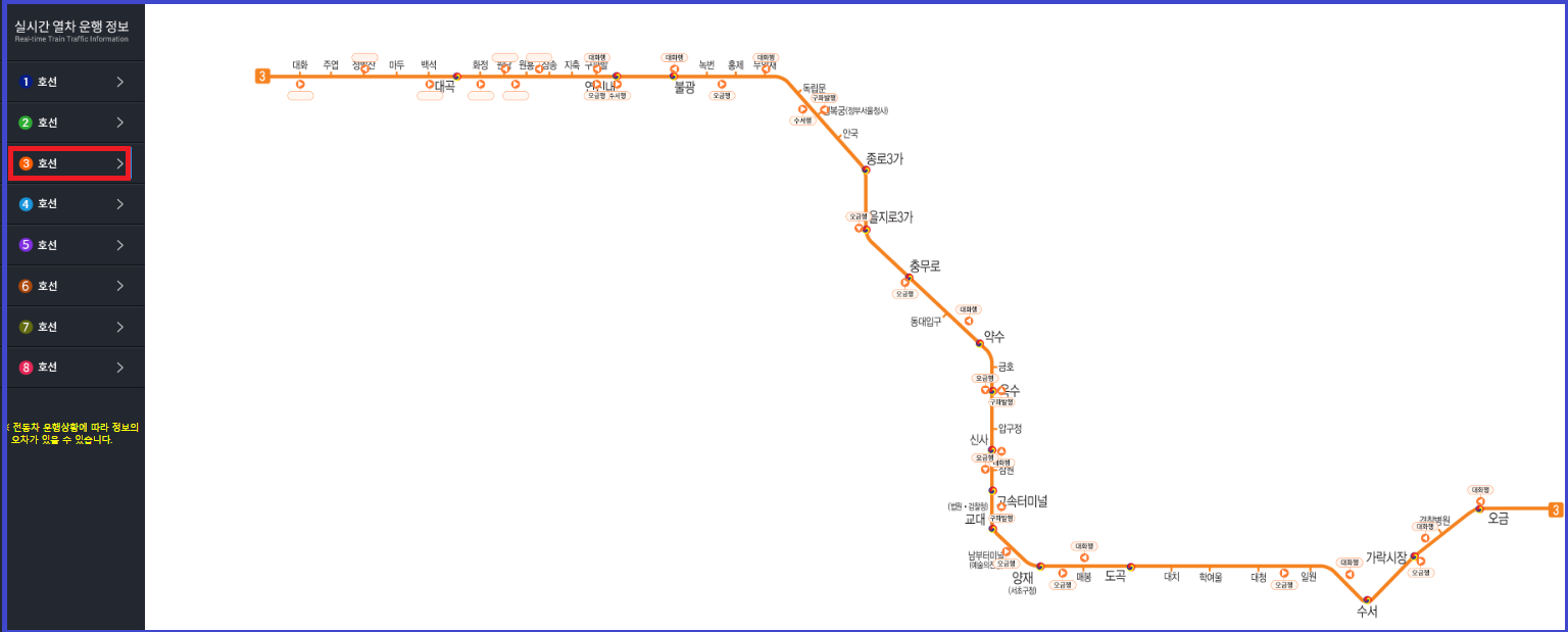 3호선은 진한 주황색으로 구성되어 있으며, 세부 노선명은 서울 지하철 3호선 입니다.