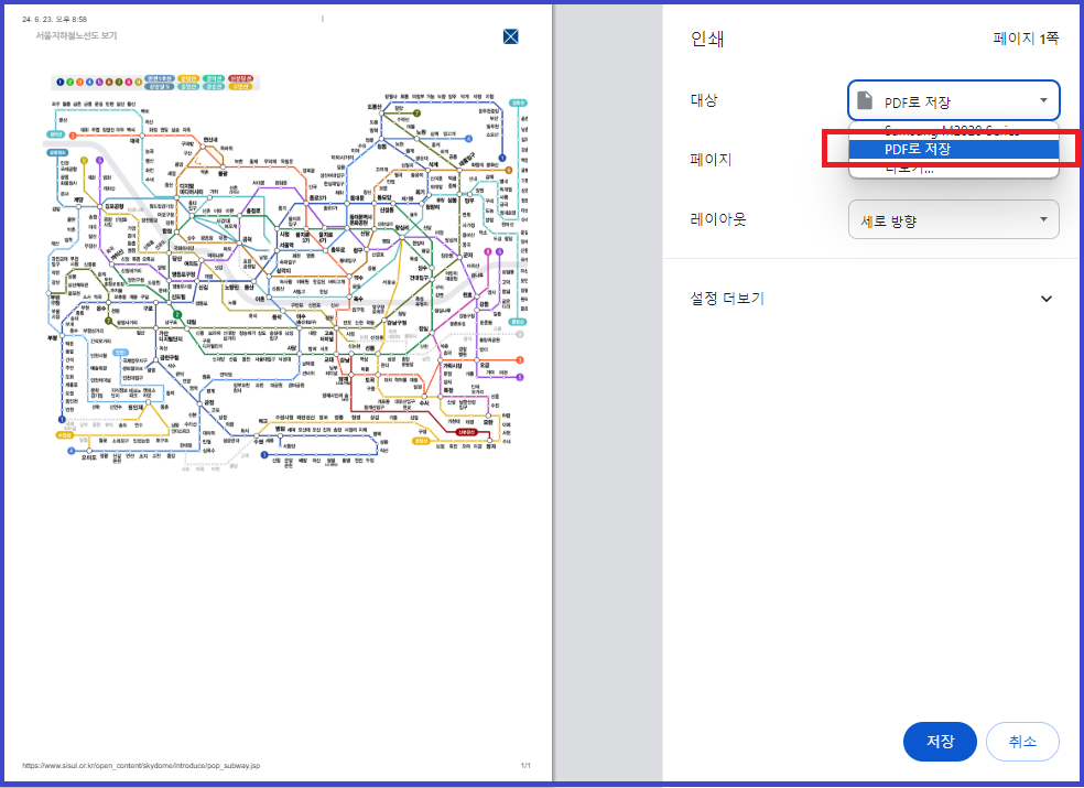 전체 노선도에서 인쇄 대상을 PDF 저장으로 선택하시면됩니다.